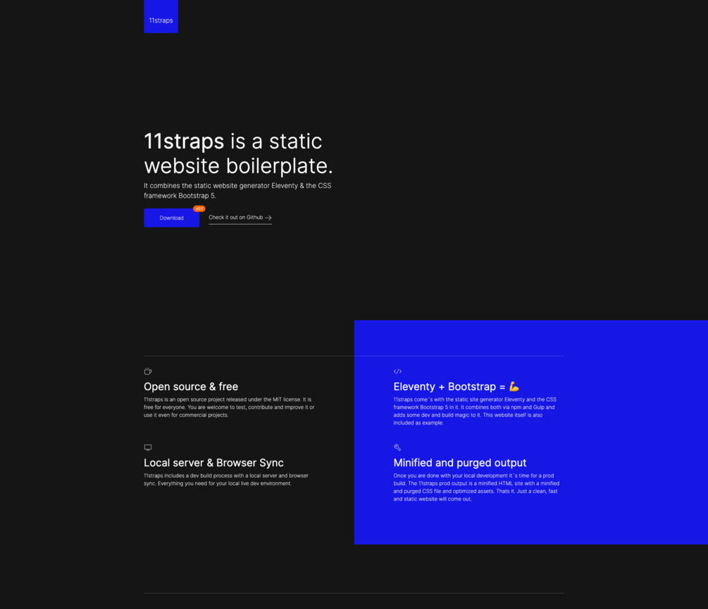 11straps is a static website boilerplate. It combines the static website generator Eleventy & the CSS framework Bootstrap 5.